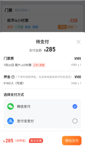 5、最后一步是完成支付。系统会跳转至支付确认页面,你可以从支持的支付方式中选择一种你最方便的,按照提示操作完成付款,之后你就成功预订了这次垂钓之旅的门票。