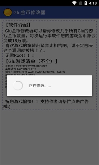 3.打开GLU金币修改器,启动修改程序,耐心等待它提示修改成功。