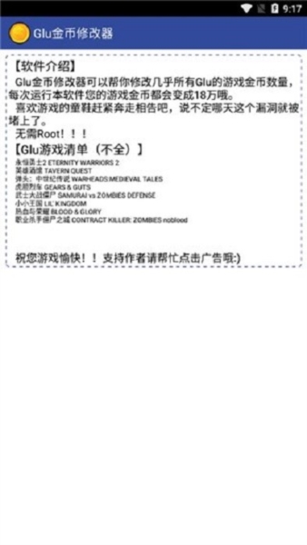 这款Glu金币修改工具相当给力,默认就能帮你把游戏里的G币调整到18万以上。它最大的一个好处就是完全不用折腾你的手机,不需要ROOT权限,只要把应用装好,打开就能直接用,所有限制都已经帮你解除了,用起来特别方便。