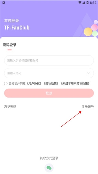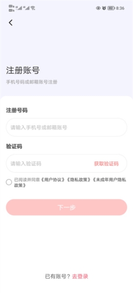 1、下载并安装好应用后,打开会看到登录页面,请选择“注册账号”选项。