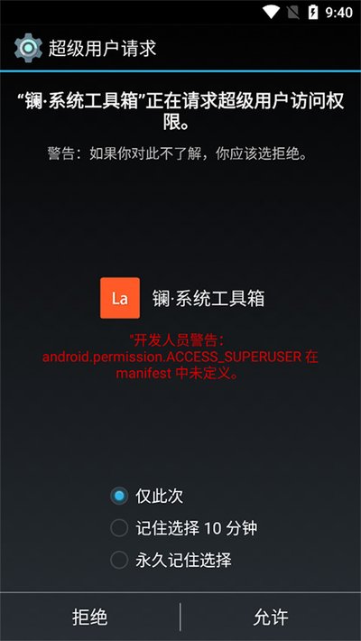第一次启动这款工具时,你会看到一个请求授权的弹窗。这个弹窗是为了让应用获得你手机的超级用户权限,从而保证各项功能都能正常运作。通常情况下,选择【仅此次】并允许就可以了。