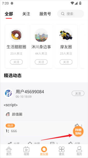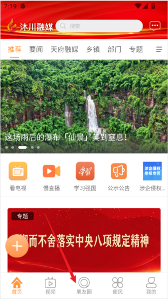 1、打开App之后,在最下面那排菜单里找到【朋友圈】功能,然后点一下;