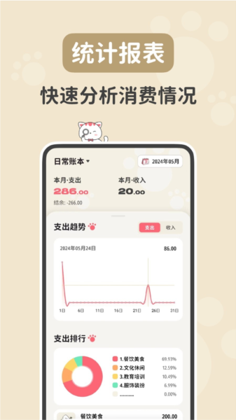 3、能够自由地查看不同时间段的收支趋势、各类消费的占比统计等,从各种角度深入分析自己的财务状况。