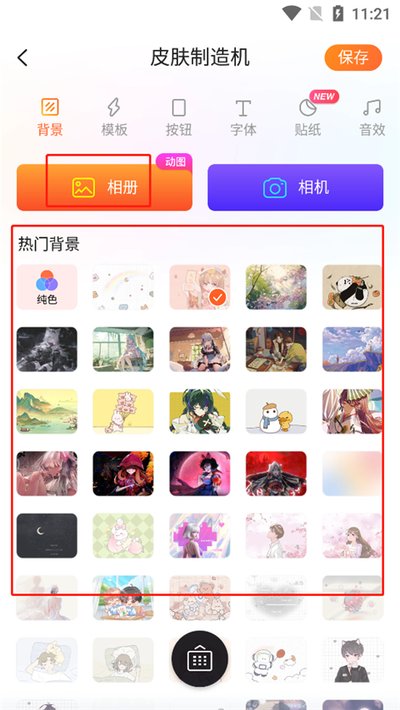 3、你可以选择平台为你准备好的精美背景图,也可以调用自己手机相册里的照片,或者干脆现场拍一张。这里我们以从相册选择为例,点击“相册”按钮。