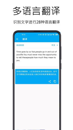 4、 文字翻译:这不仅仅是一个识别工具,还是一个便携的翻译助手。对于提取出来的文字,你可以调用它的翻译功能,在将近三十种主流语言之间进行自由切换和翻译。