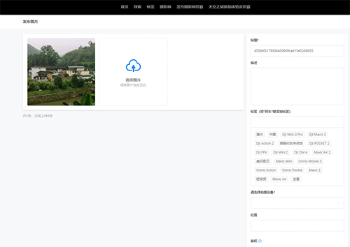 在上传页面,系统会让你选择想要分享的作品类型,可以是静态的航拍照片、动态的视频片段,或是沉浸式的360度全景图。这里我们以选择上传图片为例。