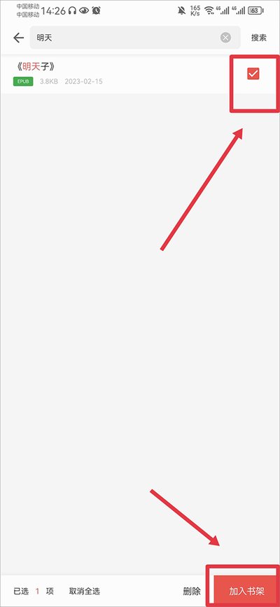2、进来之后,可以直接搜索你手机里存的电子书文件名,找到了就勾上它,再点一下“加入书架”就完事了。