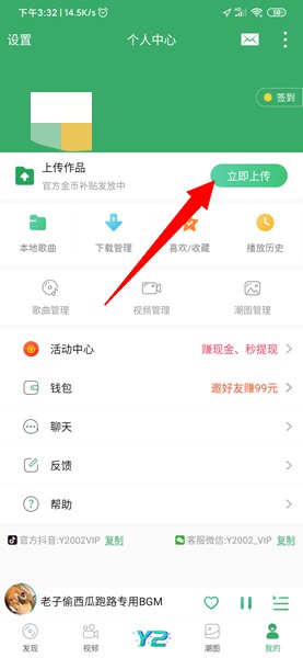 1.我们进到软件里,点右下角的“我的”,然后在个人中心页面能看到一个“立即上传”的按钮,点它进去。
