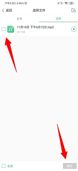 3.接着在手机文件里找到你要上传的那个音频,把它勾上,再点一下确定就行了。