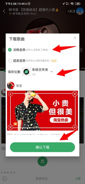3.然后就是选一下你想要的音质,比如标准、高清之类的,选好之后点“确认下载”就OK了。