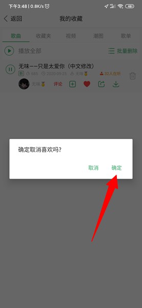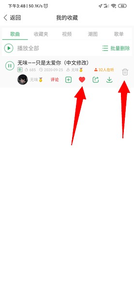 2.取消收藏其实有两种办法,一种是再点一下那个红心,让它变回空心。另一种是点歌曲右边的那个垃圾桶图标。
