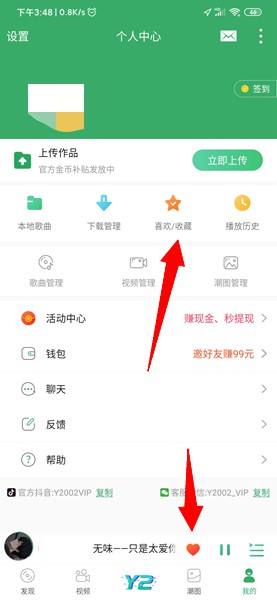 1.我们先随便找首歌收藏一下,看到下面截图里那个红心没,点一下它就亮了。然后我们回到个人中心的“喜欢/收藏”板块。