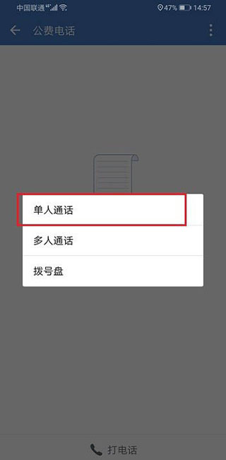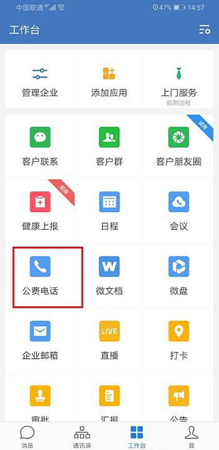 2、咱们来实际操作一下这个公费电话功能。打开企业微信,找到“公费电话”的入口点进去,再选“打电话”。