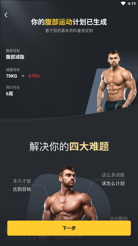1、刚打开这个App,它会先让你填一下自己的基本身体数据,别嫌烦,这是为了后面给你生成专属的腹部训练方案。大家看下面这张截图,就是这个界面。