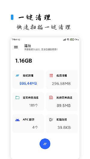 1、一键清理功能十分新颖,它会根据服务器下发的清理规则,对手机存储进行一次深度且强力的扫描,精准定位各类垃圾文件。