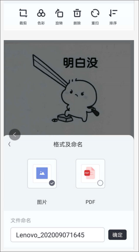 4、点击“完成”之后,会跳转到编辑界面。在这里,你可以对刚刚扫描得到的图像进行裁剪、涂抹标记或旋转等基础的排版处理。编辑妥当后点击“完成”,便会进入保存界面。你可以选择将文件存为图片格式或PDF格式,并在下方为文件命名,最后点击“确定”就大功告成了。