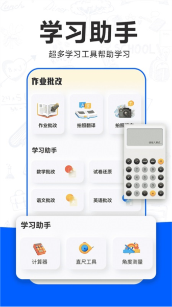 3、实用工具:软件内部还集成了一个非常方便的学习工具箱,里面包含了诸如拍照翻译、拍照识字、科学计算器,以及虚拟的尺子和量角器等多种辅助工具,让学生们在学习过程中随时都能找到趁手的帮手。
