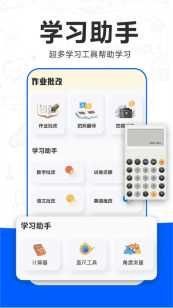 为了方便学生使用,应用内还增添了许多实用的学习小工具,比如遇到外语单词可以拍照翻译,遇到不认识的汉字可以拍照识字,还有计算器、尺子、量角器等,让学习变得得心应手。