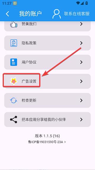 3、在这个页面里,你需要向下滑动,找到“广告设置”这个选项,然后点进去。