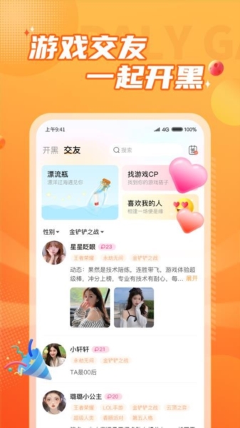 【热门游戏】全面覆盖时下最火爆的游戏,像是王者荣耀、和平精英、英雄联盟等等,你都能在这里找到开黑队友。不管是想轻松吃鸡,还是冲击更高段位,你的需求都能被满足。