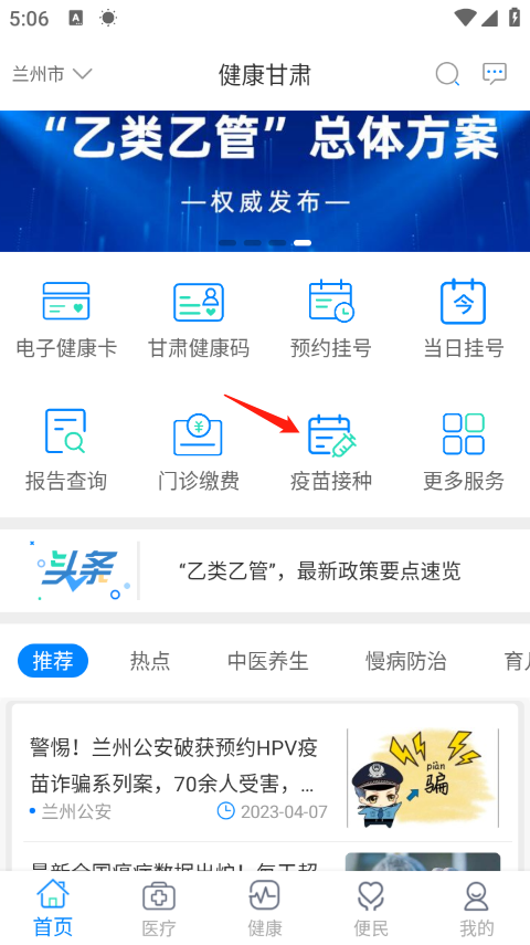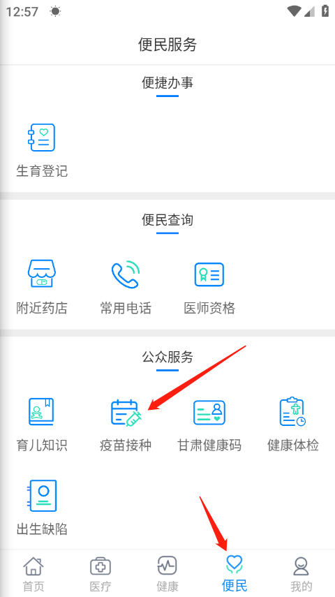 3、如果通过上述方法无法取消,可以返回到首页,点击“便民”服务,在便民服务页面里找到公众服务板块下的“疫苗接种”。
