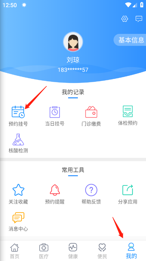 1、首先,请确保你已经安装了这款应用。打开后进入【我】的个人中心页面,然后点击“预约挂号”。