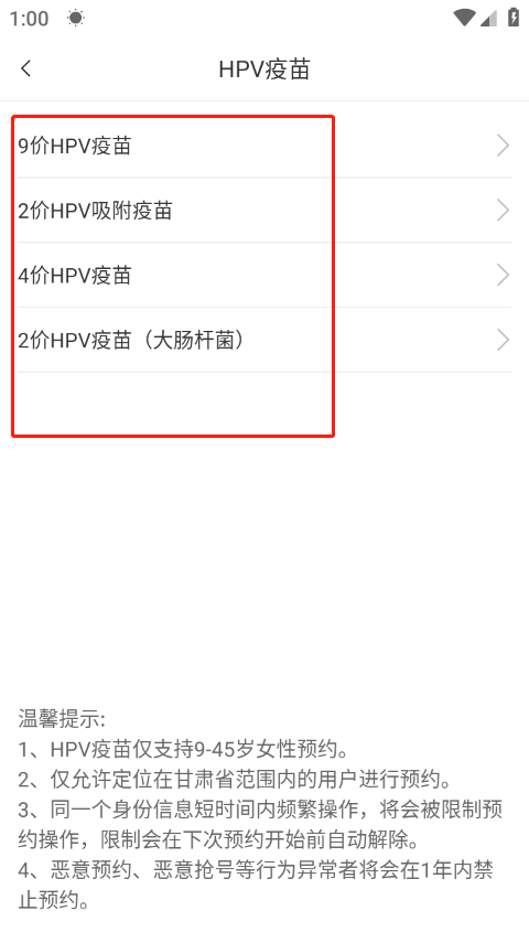 5、接下来,根据你当初预约的种类,选择对应的HPV疫苗类型。
