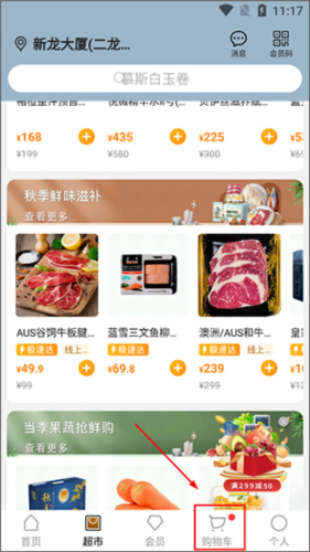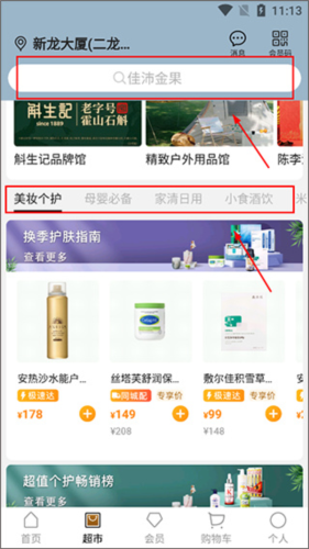 2、进入超市主页后,你可以利用顶部的搜索框直接输入商品名称,也可以通过浏览下方的商品分类来寻找心仪的物品;