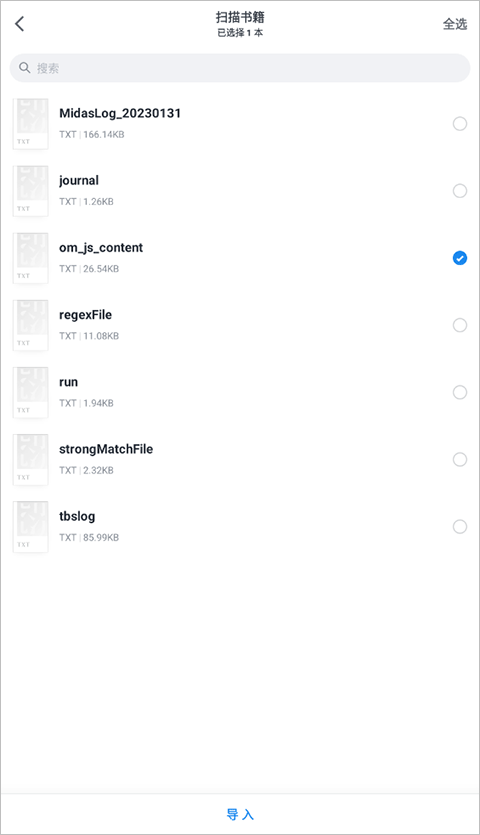 2、你可以手动从手机文件夹里寻找文件,但更快捷的方法是使用App右上方的扫描功能。它会自动帮你找出手机里的电子书,扫描完成后,勾选你想要添加的书籍,再点击导入就完成了。