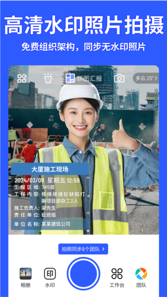 2.针对工程行业,它提供了专业的工程水印,适用于各类施工场景的拍照记录,可以替代传统的举牌验收流程。。人工智能计数功能,无论是钢筋、钢管还是木材,拍一下就能得出数量,工程验收不再愁。还能一秒制作监理日志和施工汇报,告别每天繁琐的记录工作。