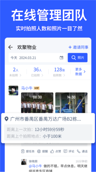 1. 成员拍照后,照片会自动同步到团队,管理者可以随时在线查看和管理整个团队的工作情况。