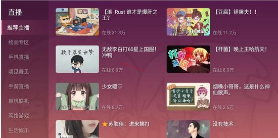 2. 进去之后就是直播广场了,各种分类都有,游戏、聊天、唱歌啥的,你就挑个自己感兴趣的直播间点进去。