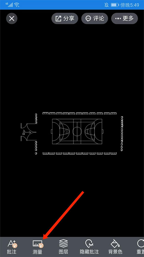 4、图纸成功加载后,在界面下方工具栏中找到并点击“测量”功能。