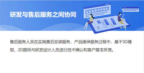 售后服务人员在现场进行产品安装、维护或保养服务的过程中,需要依据3D模型和2D图纸与研发设计人员进行技术细节的确认,并及时反馈客户现场遇到的问题和新的需求。