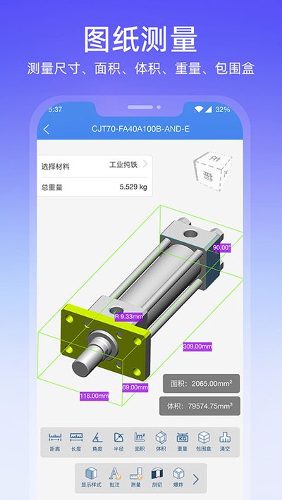 应用提供了非常出色的3D模型和2D图纸查看体验,你可以从任意角度深入观察产品的外观与内部构造。它允许你查看模型的BOM物料清单和PMI制造信息,还能测量模型的具体尺寸、计算包围盒大小、表面积、体积和重量等参数。在手机上,你可以通过丰富的交互功能来探索模型,包括切换视角、创建剖切面、查看结构树、使用测量工具、显示包围盒、读取PMI、生成爆炸图,以及进行拖拽、平移、缩放和旋转等操作。