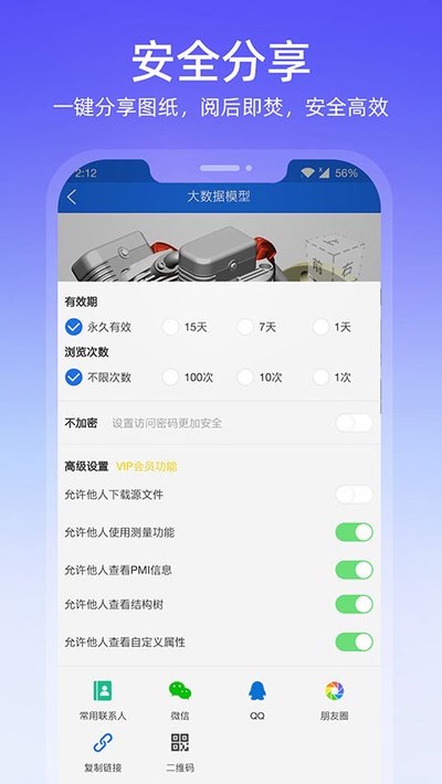 无论是手机本地还是电脑上的3D模型和CAD图纸,都可以通过一键操作分享给其他人。对于存储在云端的文件,分享过程也同样迅速。应用提供了“公开分享”和“加密分享”两种模式。选择加密分享时,你可以为链接设置访问密码、有效期限和可访问次数,并精细控制对方的查看权限,从而确保文件在分享过程中的绝对安全。