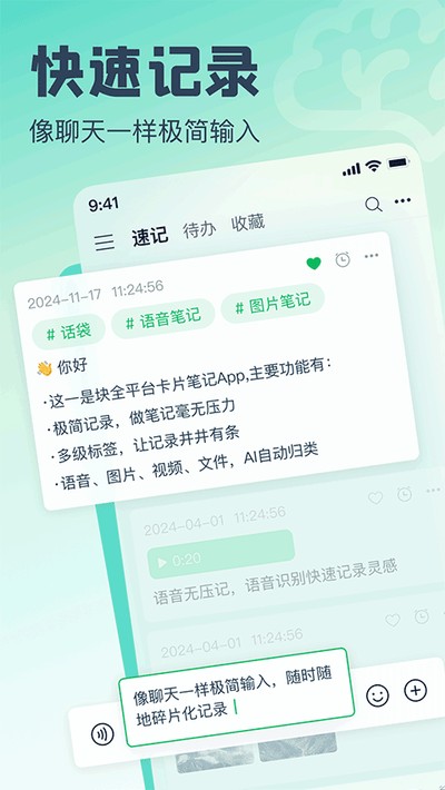4、语音快速记录:脑子里冒出什么想法,直接用语音功能录下来,它能自动转文字,省得打字,以后想找也方便。