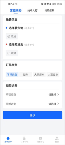 2、除了在抢单大厅里找活儿,用户还可以根据自己的需求自定义填写常跑路线信息,并且可以设定自己的期望运费。