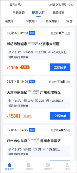 2、你可以根据装货地、卸货地等具体条件来筛选货源,找到合适的单子就能立刻抢。