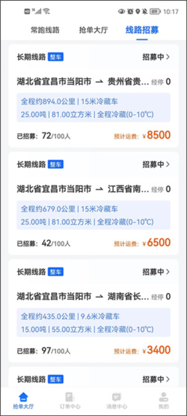 3、软件首页的“路线招募”功能发布了海量招募订单,为司机师傅们提供了丰富的接单机会,无需担忧货源问题。。