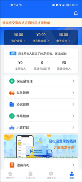 5、在“我的”这个功能区里,不仅有保证金管理,还提供了车队管理、协议管理等功能。司机师傅们在使用前可以先阅读一下管理制度,邀请朋友一起上线使用还能获得一些现金奖励。