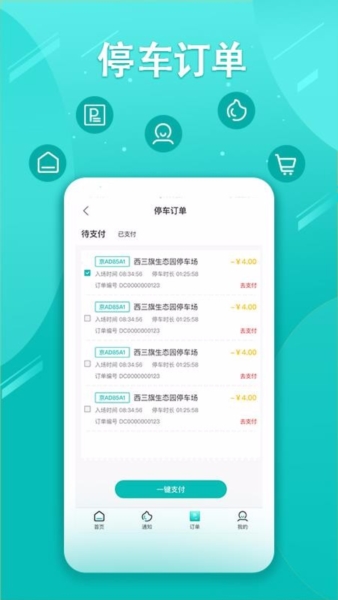 5、要缴费的时候,就切换到停车订单中心,找到待支付的账单,勾选后点一键支付就完事了。