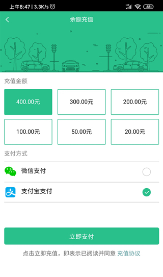 3.然后就是选择你要充的金额和支付方式,选好之后,点击“立即支付”。