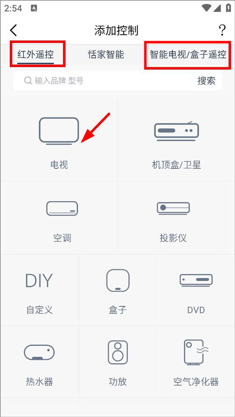 2、在添加设备的界面中,根据你家电视的类型,选择“红外遥控”或者“智能电视/盒子遥控”这两个选项之一。