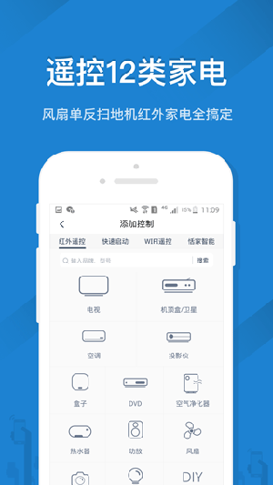 3、支持控制多达12种不同类型的家用电器,从风扇、单反相机到扫地机器人,只要是红外设备,它都能管。