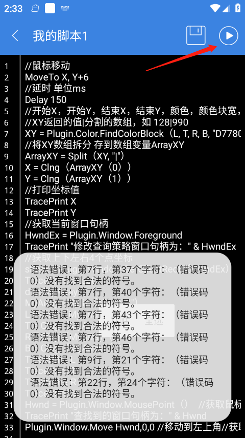 5、这里我们用网上找的一段游戏脚本代码作为例子。把代码输入进去之后,点击界面右上角的运行按钮来测试一下。