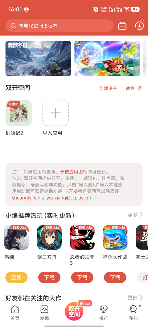 1、打开虫虫助手后,你会看到底部有五个清晰的导航板块,分别是首页、游戏库、排行、广场和双开空间。