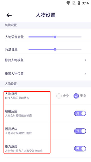 要是对角色的一些默认设置不满意,可以点右边的“我的”,再进“人物设置”里调整。比如人物显示方式、触摸反应、摇晃手机的反应,都能自定义。
