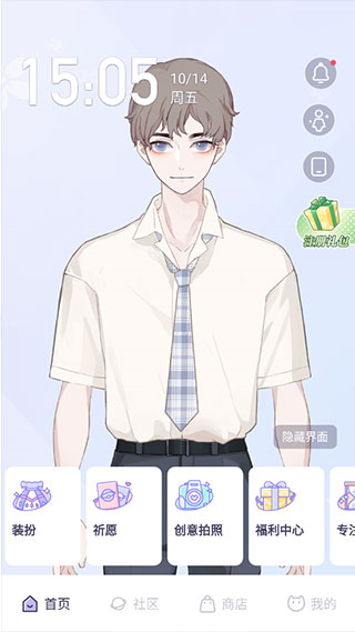 搞定之后就正式进到主界面了。用下来的感受是,这个界面设计得有点像手机桌面,左上角是时间,底下是核心功能,比如装扮、祈愿、创意拍照这些。看到截图里这个界面没: