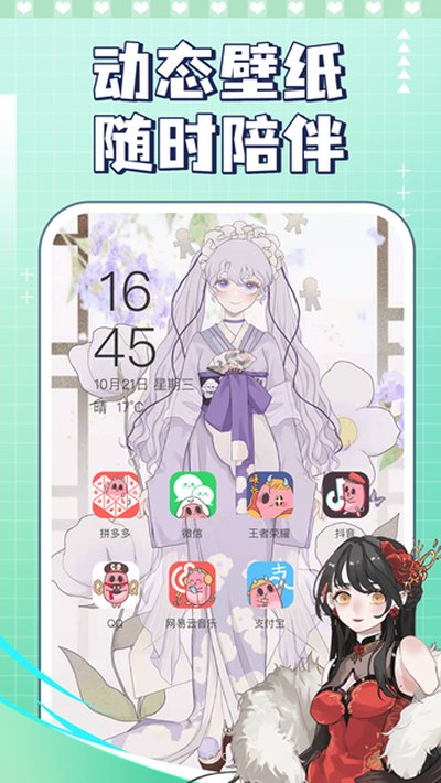 动态壁纸功能算是这软件的一个杀手锏了。直接打破次元壁,让你捏的角色能常驻在你的三次元手机桌面。把自己最喜欢的人设和装扮弄好,直接设置成壁纸。这样一解锁手机就能看到,实现了随时陪伴。